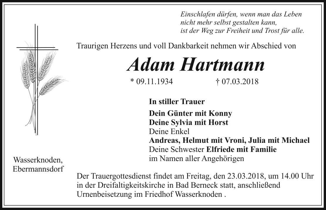 Der Trauergottesdienst findet am Freitag, den 23.03.2018, um 14.00 Uhr in der Dreifaltigkeitskirche in Bad Berneck statt, anschließend Urnenbeisetzung im Friedhof Wasserknoden .