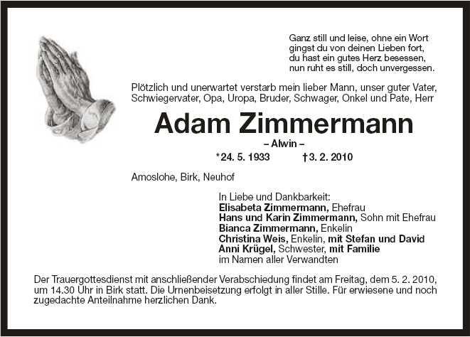 Der Trauergottesdienst mit anschließender Verabschiedung findet am Freitag, den 5.2.2010 um 14.30 Uhr in Birk statt. Die Urnenbeisetzung erfolgt in aller Stille.