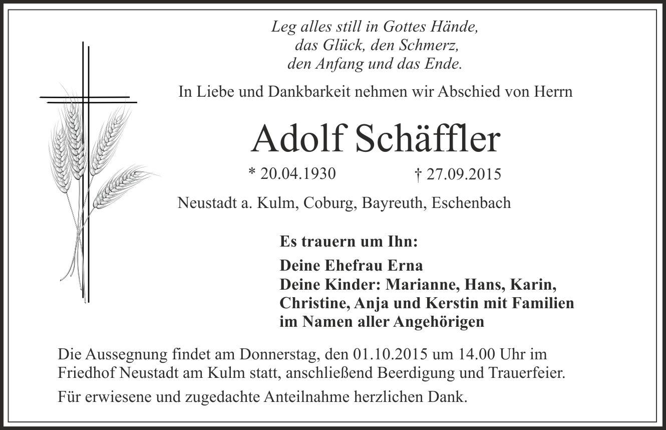 Die Aussegnung findet am Donnerstag, den 01.10.2015, um 14.00 Uhr im Friedhof Neustadt am Kulm statt, anschließend Beerdigung und Trauerfeier. Für bereits erwiesene und noch zugedachte Anteilnahme herzlichen Dank.