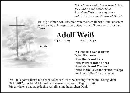 Der Trauegottesdienst mit anschließender Urnenbeisetzung findet am Freitag, dem 30.11.2012, um 14.30 Uhr auf dem neuen Friedhof in Pegnitz statt.