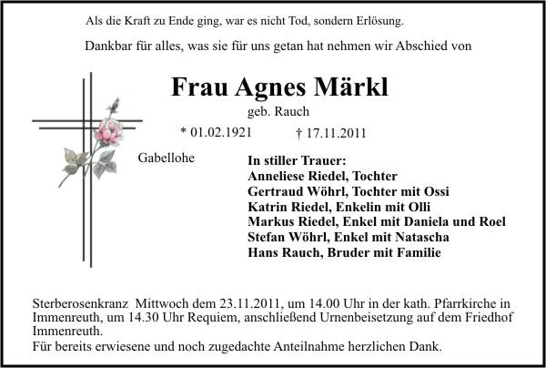 Der Trauergottesdienst findet am Mittwoch, dem 23.11.2011 um 14.00 Uhr in der kath. Pfarrkirche Immenreuth statt, anschlißend Urnenbeisetzung auf dem Friedhof Immenreuth.