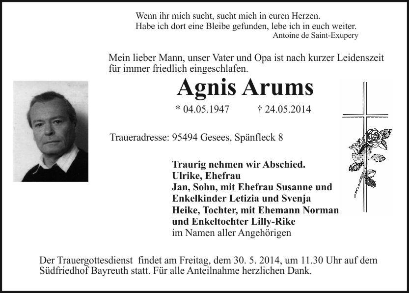 Der Trauergottesdienst findet am Freitag, dem 30. 5. 2014, um 11.30 Uhr auf dem Südfriedhof Bayreuth statt. Für alle Anteilnahme herzlichen Dank.