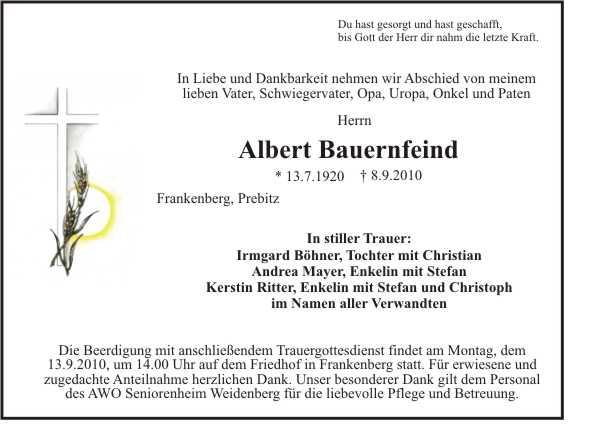 Die Beisetzung findet am Montag, 13.09.2010 um 14:00 Uhr auf dem Friedhof in Frankenberg statt.
