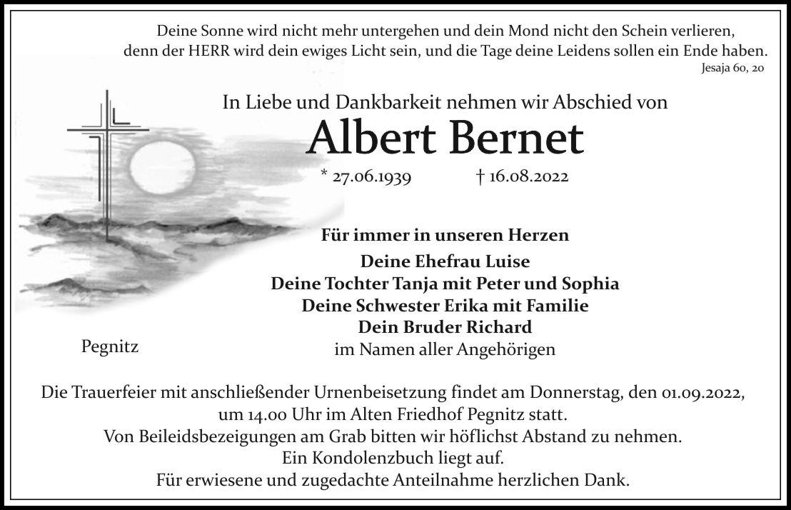 Die Trauerfeier mit anschließender Urnenbeisetzung findet am Donnerstag, den 01.09.2022, um 14.00 Uhr im Alten Friedhof Pegnitz statt.