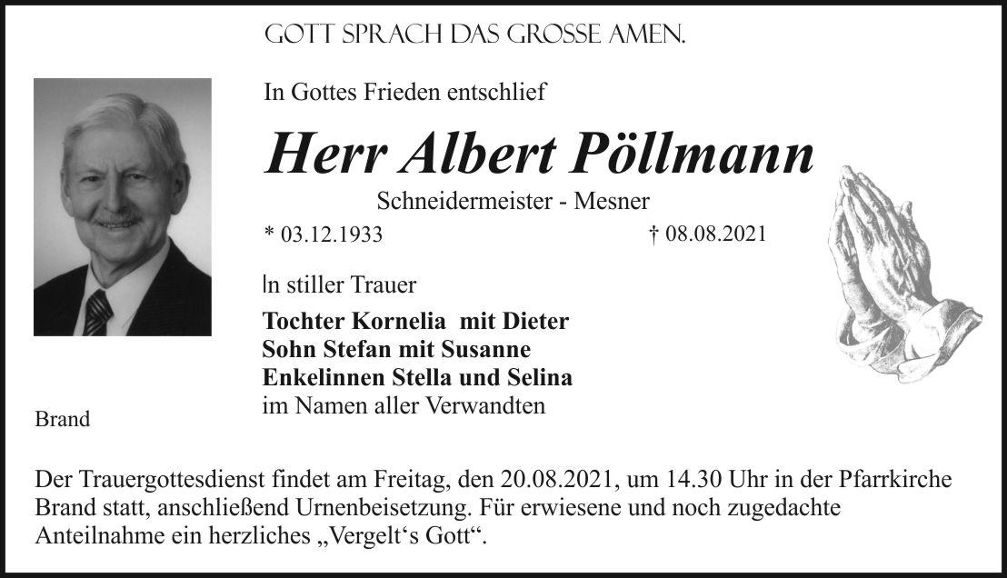 Der Trauergottesdienst findet am Freitag, den 20.08.2021, um 14.30 Uhr in der Pfarrkirche Brand statt, anschließend Urnenbeisetzung. Für erwiesene und noch zugedachte Anteilnahme ein herzliches „Vergelt‘s Gott“.