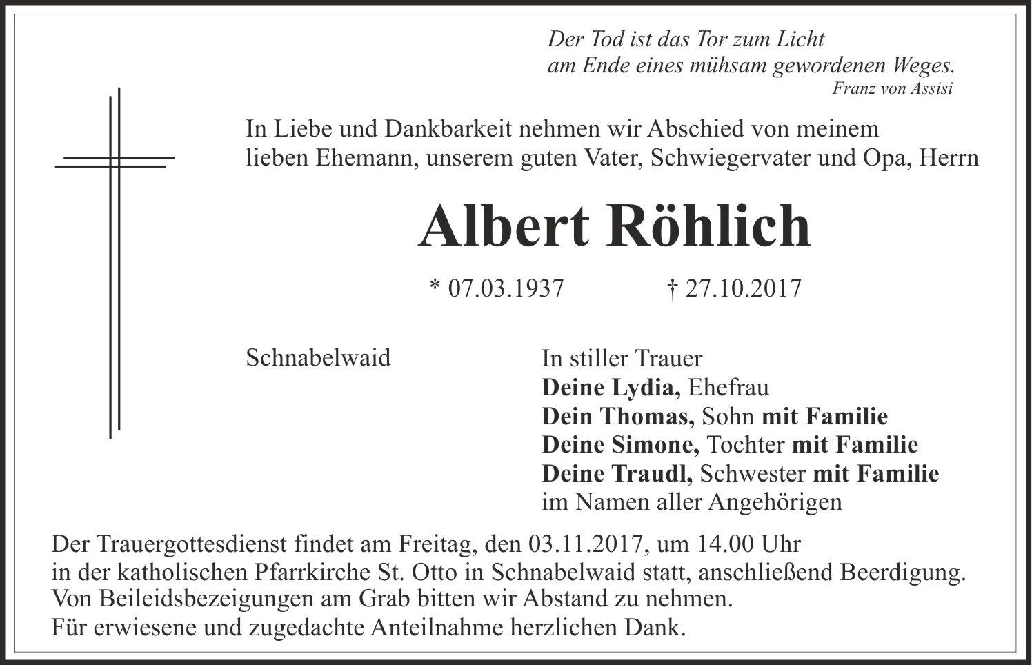 Der Trauergottesdienst findet am Freitag, den 03.11.2017, um 14.00 Uhr in der katholischen Pfarrkirche St. Otto in Schnabelwaid statt, anschließend Beerdigung. Für alle Anteilnahme herzlichen Dank.
