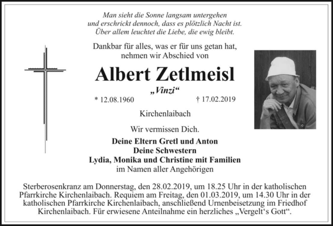 Sterberosenkranz am Donnerstag, den 28.02.2019, um 18.25 Uhr in der katholischen Pfarrkirche Kirchenlaibach. Requiem am Freitag, den 01.03.2019, um 14.30 Uhr in der katholischen Pfarrkirche Kirchenlaibach, anschließend Urnenbeisetzung im Friedhof Kirchenlaibach. Für erwiesene Anteilnahme ein herzliches „Vergelt‘s Gott“.