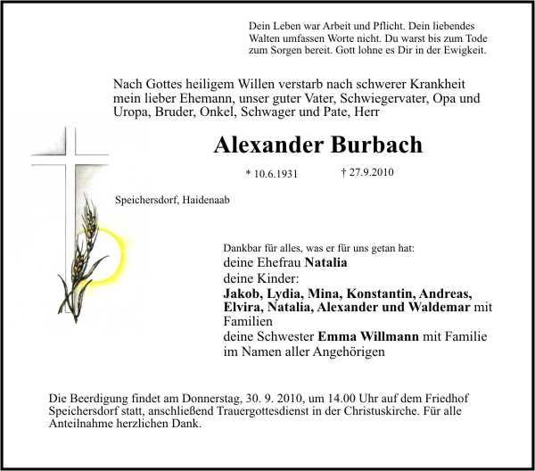 Die Beisetzung findet am Donnerstag, 30.09.2010 um 14:00 Uhr auf dem Friedhof in Speichersdorf statt.