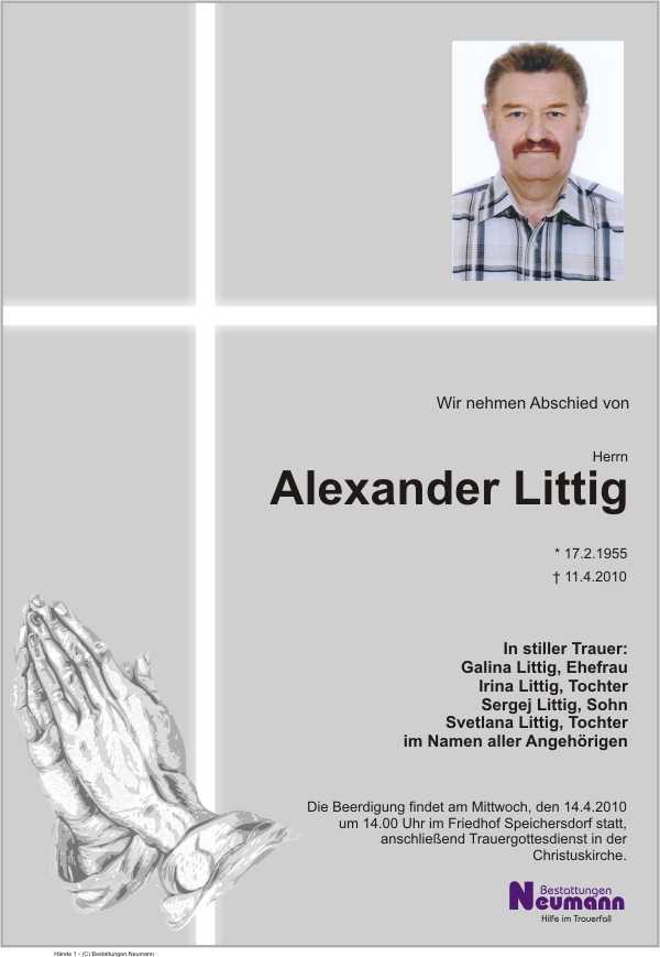Die Beisetzung findet am Mittwoch, 14.04.2010 um 14:00 Uhr auf dem Friedhof in Speichersdorf statt.