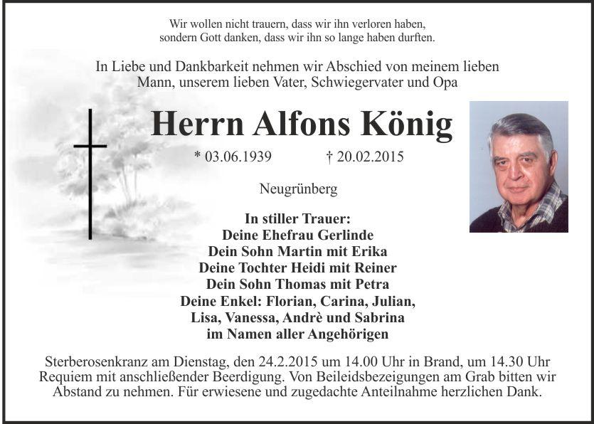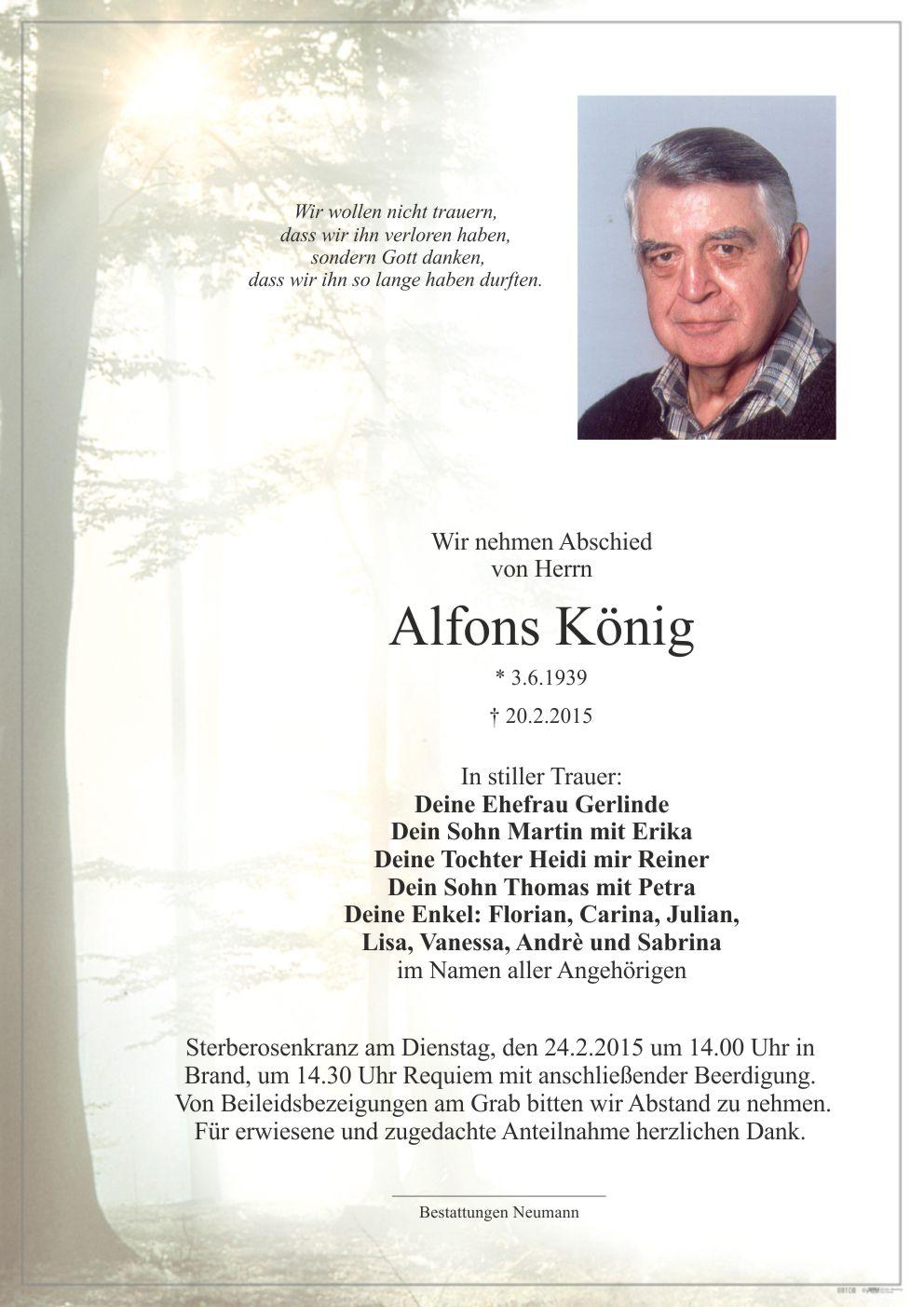 Sterberosenkranz am Dienstag, den 24.2.2015, um 14.00 Uhr in der kath. Pfarrkirche Brand, anschließend um 14.30 Uhr Requiem und Beerdigung. Von Beileidsbezeigungen am Grab bitten wir Abstand zu nehmen. Für alle Anteilnahme herzlichen Dank.