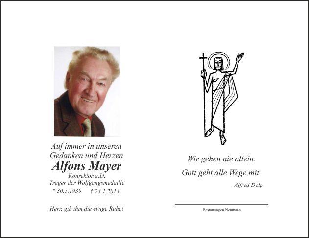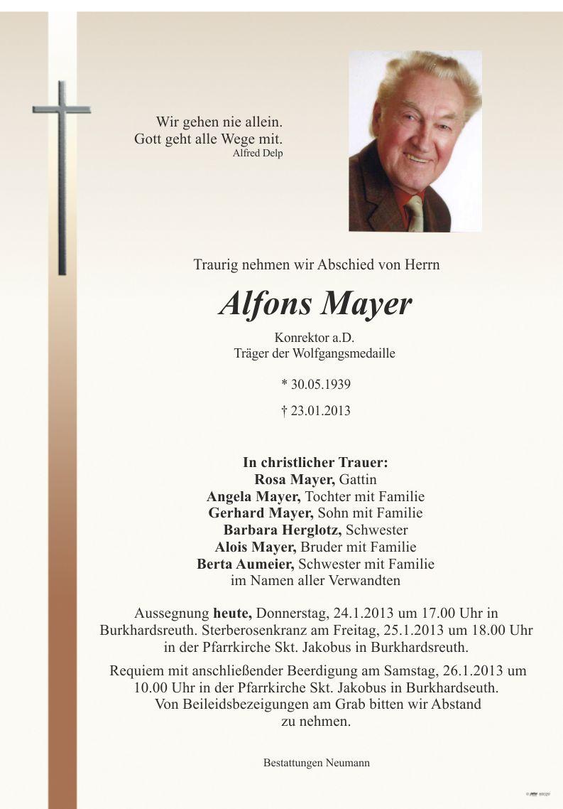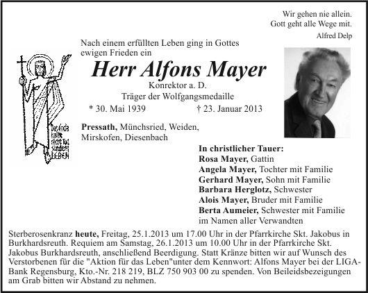 Sterberosenkranz heute, Freitag, den 25.1.2013, um 18.00 Uhr in Burkardsreuth. Das Requiem mit anschließender Beerdigung findet am Samstag, dem 26.1.2013, um 10.00 Uhr in der Pfarrkirche St. Jakobus in Burkardsreuth statt. Anstelle von Kränzen bitten wir, auf Wunsch des Verstorbenen, für die "Aktion für das Leben", Kto-Nr. 218219, LIGA-Bank Regensburg, BLZ 750 903 00 Kennwort "Alfons Mayer" zu spenden. Von Beileidsbezeigungen am Grab bitten wir Abstand zu nehmen.