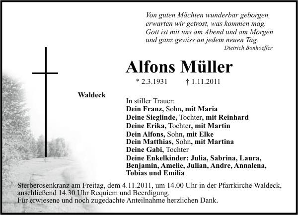 Sterberosenkranz am Freitag, 4.11.2011, um 14.00 Uhr in der katholischen Pfarrkirche in Waldeck, anschließend Requiem und Beerdigung.
