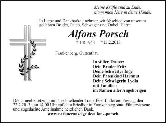Die Urnenbeisetzung mit anschließender Trauerfeier findet am Freitag, den 22.2.2013, um 14:00 Uhr auf dem Friedhof in Frankenberg statt. Für erwiesene und zugedachte Anteilnahme herzlichen Dank.