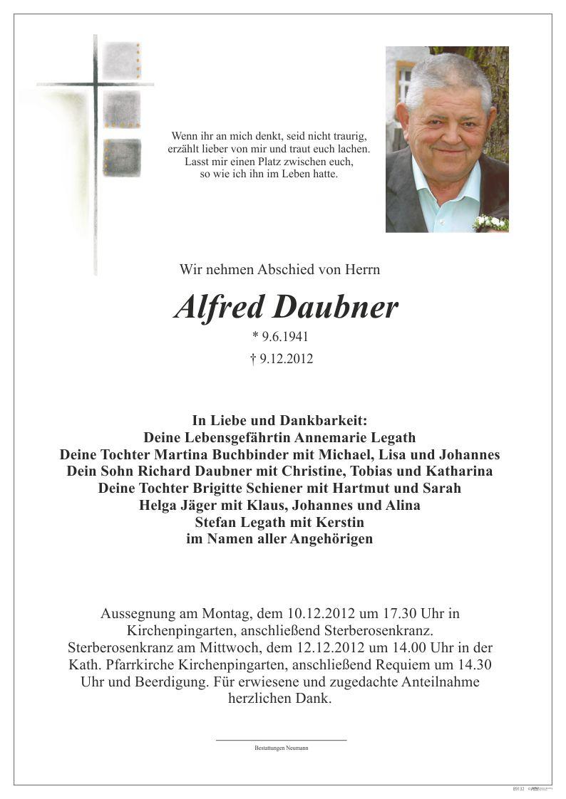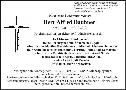 Auch ich wünsche den Angehörigen des viel zu früh verstorbenen Herrn Alfred Daubner Kraft und Stärke, die Trauer überwinden zu können.