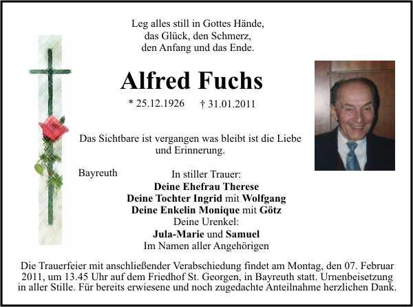 Die Trauerfeier mit anschließender Verabschiedung, findet am Montag dem 7.2.2011 um 13.45 Uhr auf dem Friedhof, St. Georgen in Bayreuth statt. Urnenbeisetzung im Familienkreis.