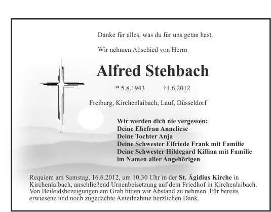 Requiem am Samstag, 16.6.2012, um 10.30 Uhr in der alten Dorfkirche in Kirchenlaibach, anschließend Urnenbeisetzung auf dem Friedhof in Kirchenlaibach. Von Beileidsbezeigungen am Grab bitten wir Abstand zu nehmen. Für bereits erwiesene und noch zugedachte Anteilnahme herzlichen Dank.
