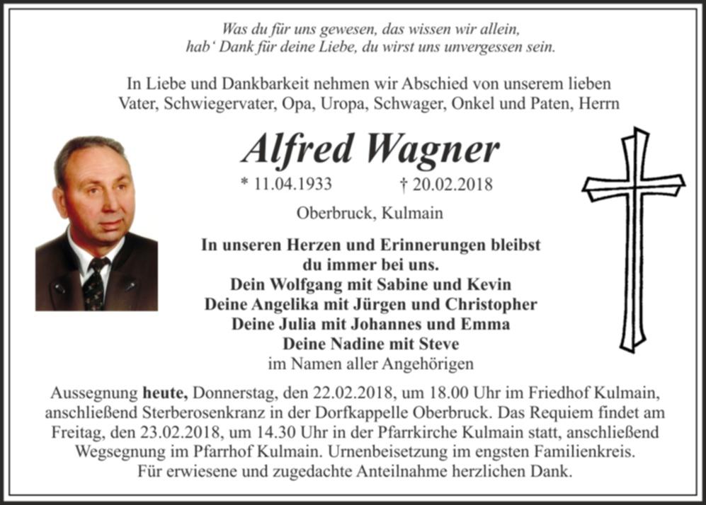 Aussegnung Donnerstag, den 22.02.2018, um 18.00 Uhr im Friedhof Kulmain, anschließend Sterberosenkranz in der Dorfkapelle Oberbruck. Requiem am Freitag, den 23.02.2018, um 14.30 Uhr in der Pfarrkirche Kulmain, anschließend Wegsegnung im Pfarrhof Kulmain. Urnenbeisetzung im engsten Familienkreis. Für erwiesene und zugedachte Anteilnahme herzlichen Dank.