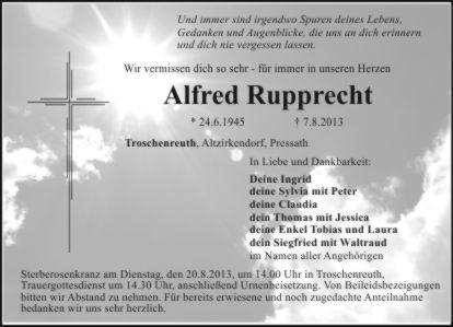 Sterberosenkranz am Dienstag, den 20.8.2013, um 14.00 Uhr in Troschenreuth, Trauergottesdienst um 14.30 Uhr, anschließend Urnenbeisetzung. Von Beileidsbezeigungen bitten wir Abstand zu nehmen. Für bereits erwiesene und noch zugedachte Anteilnahme bedanken wir uns sehr herzlich.