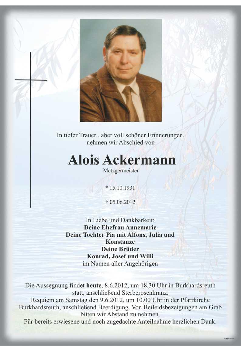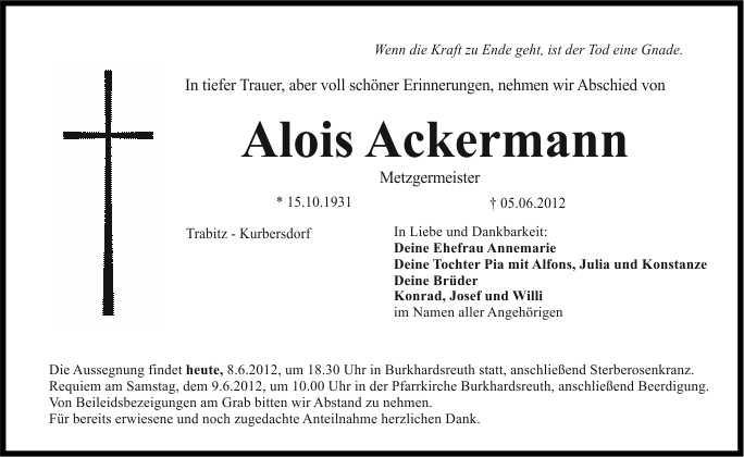 Die Aussegnung findet heute, 8.6.2012, um 18.30 Uhr in Burkhardsreuth statt, anschließend Sterberosenkranz.