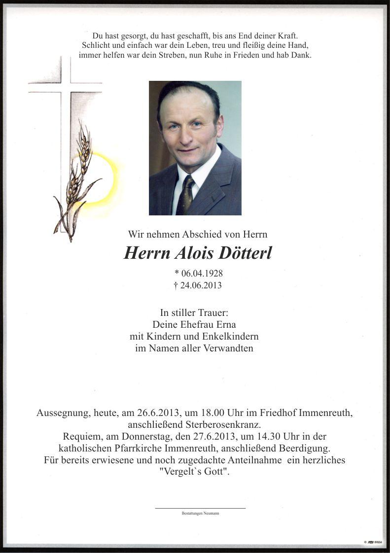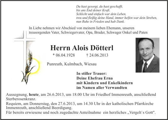 Requiem, am Donnerstag, den 27.6.2013, um 14.30 Uhr in der katholischen Pfarrkirche Immenreuth, anschließend Beerdigung.
