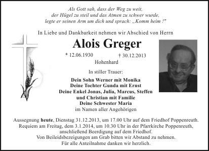 Requiem am Freitag, dem 3.1.2014, um 10.30 Uhr in der Pfarrkirche Poppenreuth, anschließend Beerdigung auf dem Friedhof.