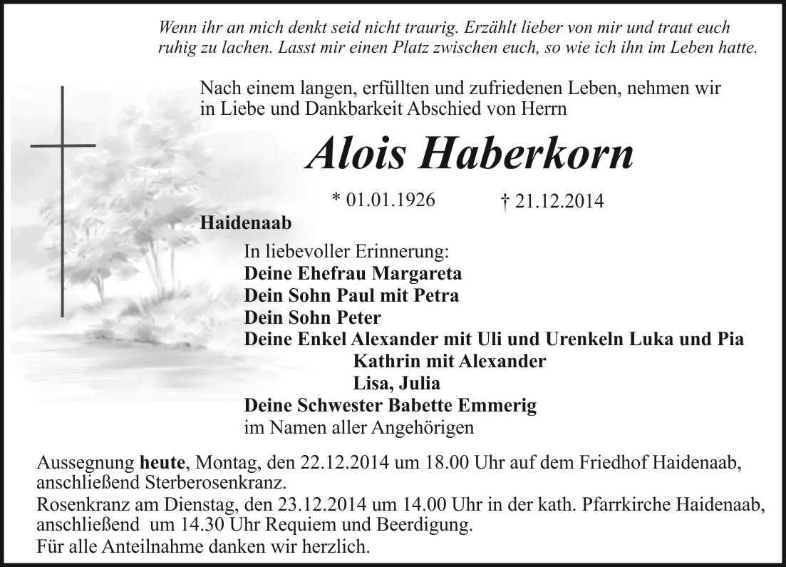 Rosenkranz am Dienstag, den 23.12.2014 um 14.00 Uhr in der kath. Pfarrkirche Haidenaab, anschließend um 14.30 Uhr Requiem und Beerdigung.