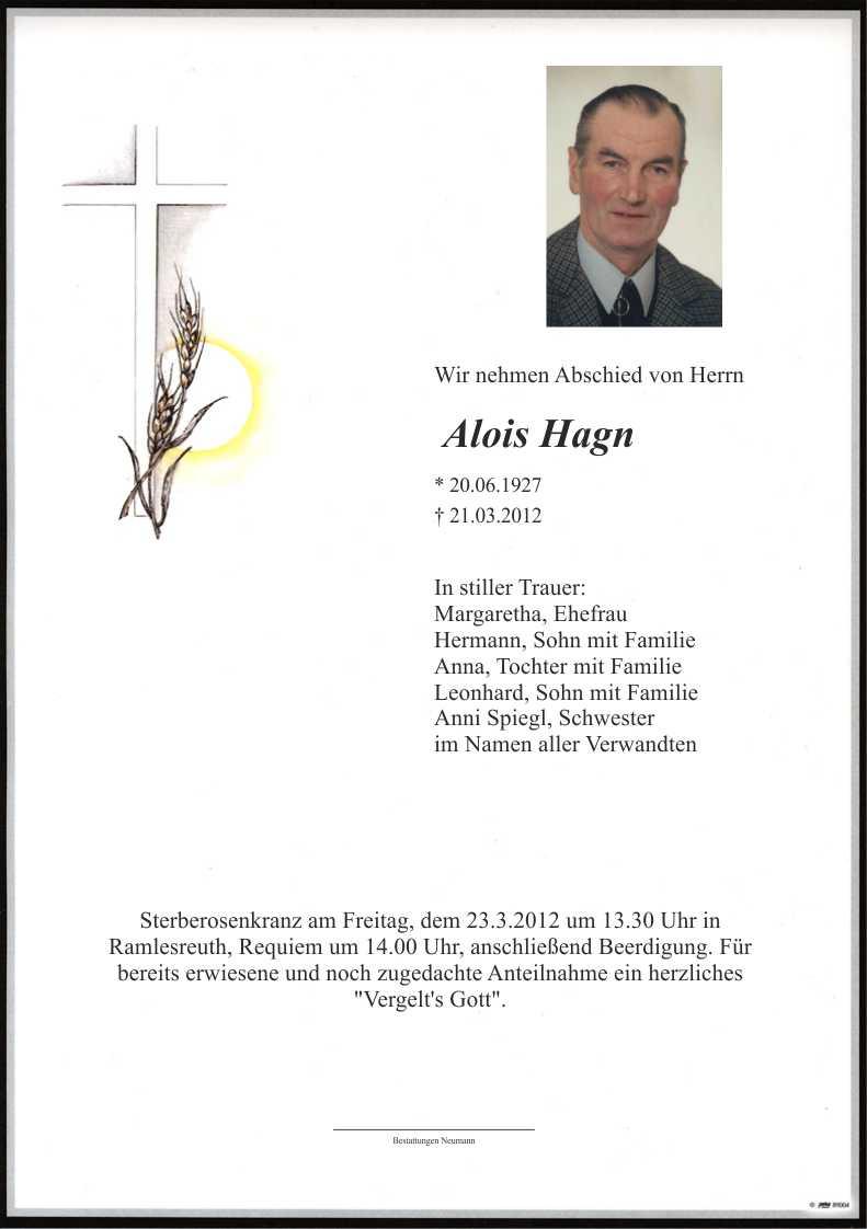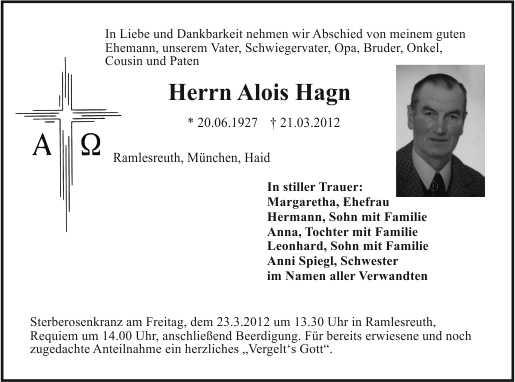 Sterberosenkranz am Freitag, dem 23.3.2012 um 13.30 Uhr in Ramlesreuth, Requiem um 14.00 Uhr, anschließend Beerdigung. Für bereits erwiesene und noch zugedachte Anteilnahme ein herzliches „Vergelt‘s Gott“.