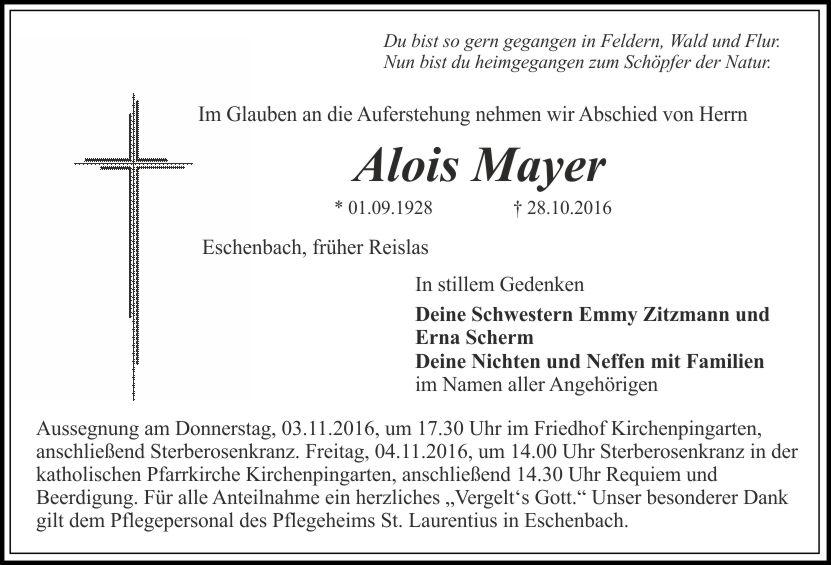 Aussegnung am Donnerstag, 03.11.2016, um 17.30 Uhr im Friedhof Kirchenpingarten, anschließend Sterberosenkranz. Freitag, 04.11.2016, um 14.00 Uhr Sterberosenkranz in der katholischen Pfarrkirche Kirchenpingarten, anschließend 14.30 Uhr Requiem und Beerdigung. Für alle Anteilnahme ein herzliches „Vergelt‘s Gott.“ Unser besonderer Dank gilt dem Pflegepersonal des Pflegeheims St. Laurentius in Eschenbach.