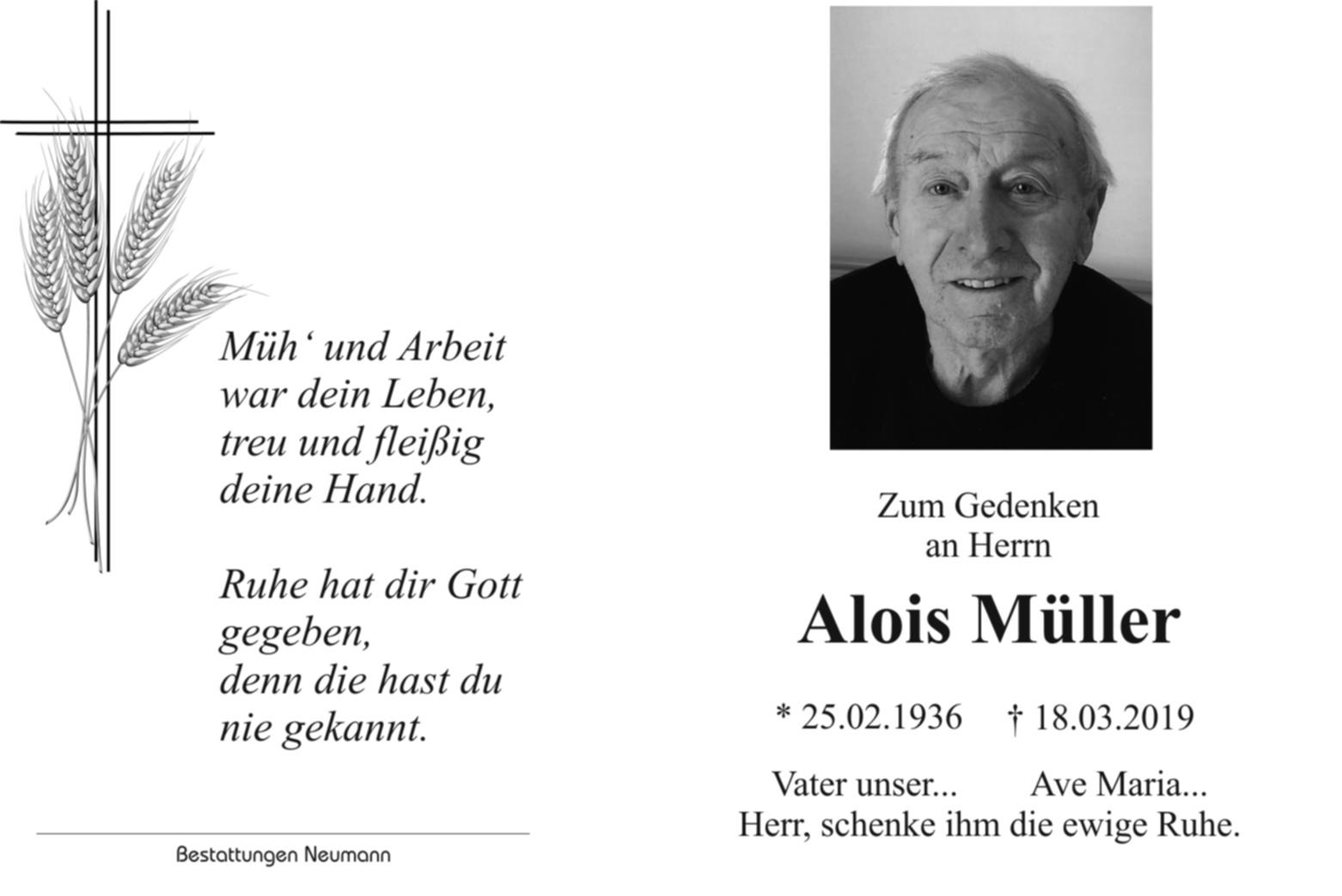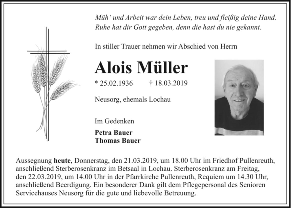 Aussegnung am Donnerstag, den 21.03.2019, um 18.00 Uhr im Friedhof Pullenreuth, anschließend Sterberosenkranz im Betsaal in Lochau. Sterberosenkranz am Freitag, den 222.03.2019, um 14.00 Uhr in der Pfarrkirche Pullenreuth, um 14.30 Uhr Requiem, anschließend Beerdigung.