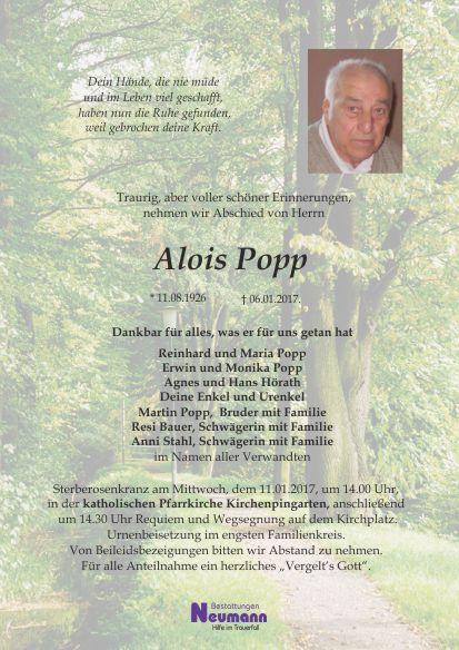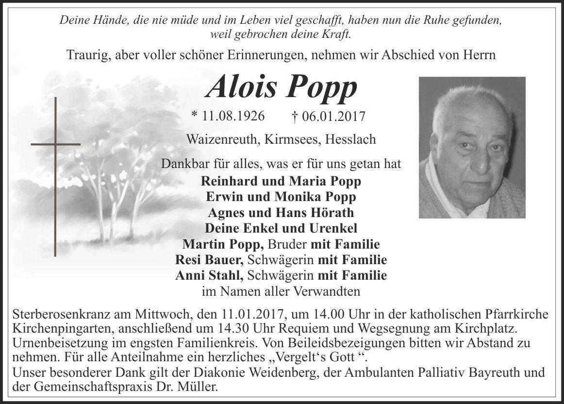 Sterberosenkranz am Mittwoch, den 11.01.2017, um 14.00 Uhr in der katholischen Pfarrkirche Kirchenpingarten, anschließend um 14.30 Uhr Requiem und Wegsegnung am Kirchplatz. Urnenbeisetzung im engsten Familienkreis. Von Beileidsbezeigungen bitten wir Abstand zu nehmen. Für alle Anteilnahme ein herzliches „Vergelt‘s Gott “.