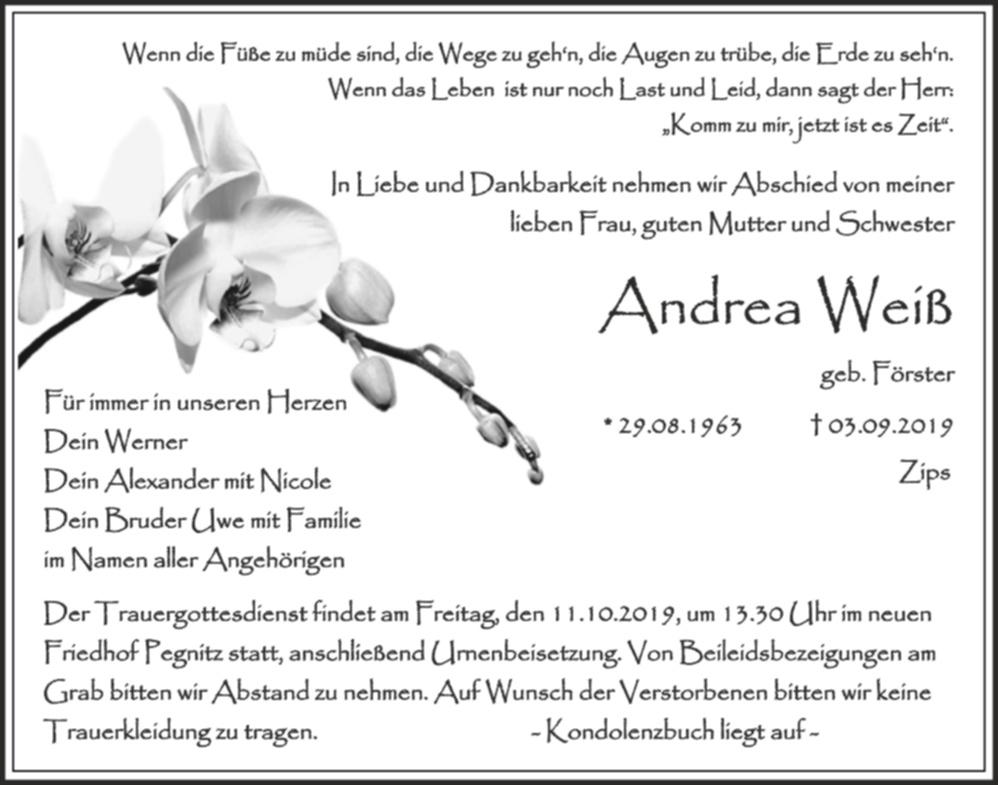 Der Trauergottesdienst findet am Freitag, den 11.10.2019, um 13.30 Uhr im neuen Friedhof Pegnitz statt, anschließend Urnenbeisetzung. Von Beileidsbezeigungen am Grab bitten wir Abstand zu nehmen. Auf Wunsch der Verstorbenen bitten wir keine Trauerkleidung zu tragen.