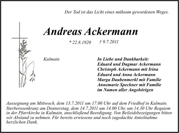 Die Beisetzung findet am Donnerstag, 14.07.2011 um 14:00 Uhr auf dem Friedhof in Kulmain statt.