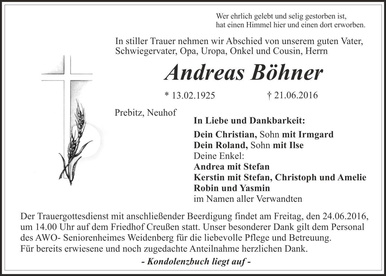 Der Trauergottesdienst mit anschließender Beerdigung findet am Freitag, den 24.06.2016, um 14.00 Uhr auf dem Friedhof Creußen statt. Unser besonderer Dank gilt dem Personal des AWO- Seniorenheimes Weidenberg für die liebevolle Pflege und Betreuung. - Kondolenzbuch liegt auf -