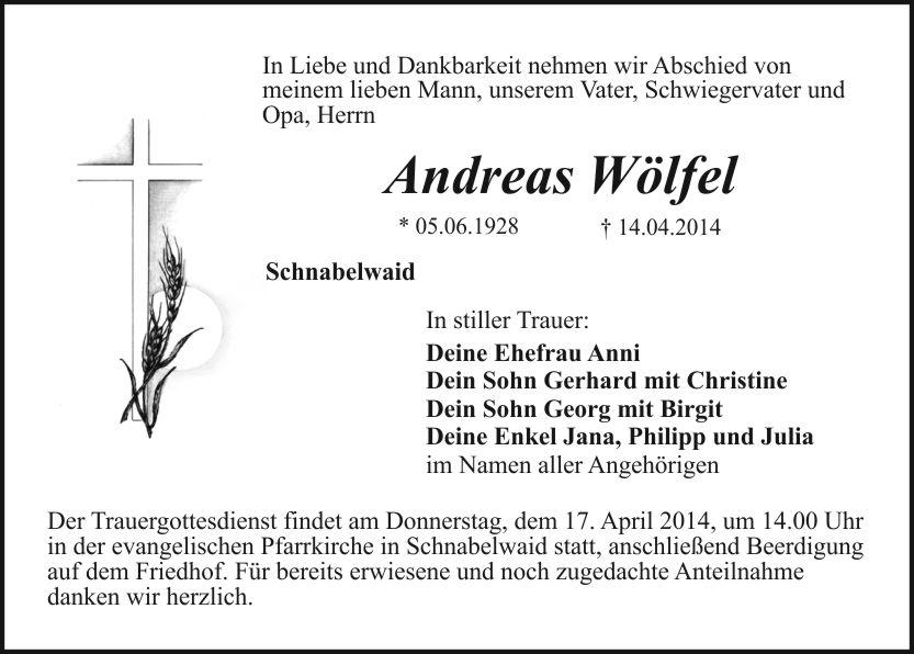 Der Trauergottesdienst findet am Donnerstag, dem 17. April 2014, um 14.00 Uhr in der evangelischen Pfarrkirche in Schnabelwaid statt, anschließend Beerdigung auf dem Friedhof. Für bereits erwiesene und noch zugedachte Anteilnahme danken wir herzlich.