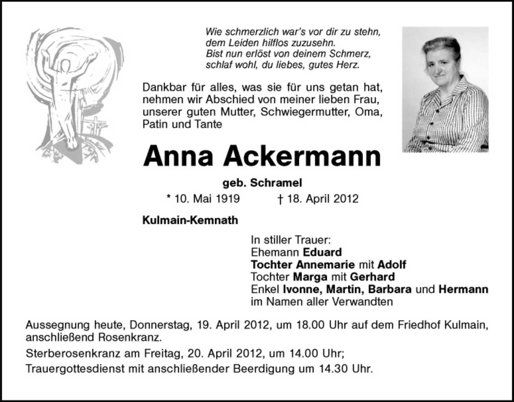 Aussegnung heute, Donnerstag, 19.4.2012 um 18.00 Uhr auf dem Friedhof Kulmain, anschließend Rosenkranz.