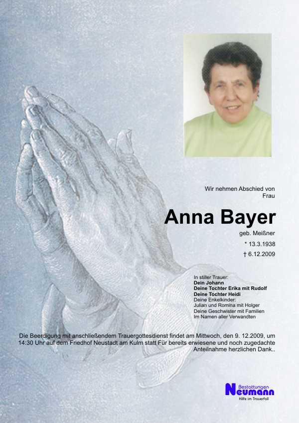 Die Beisetzung findet am Mittwoch, 09.12.2009 um 14:30 Uhr auf dem Friedhof in Neustadt am Kulm statt.