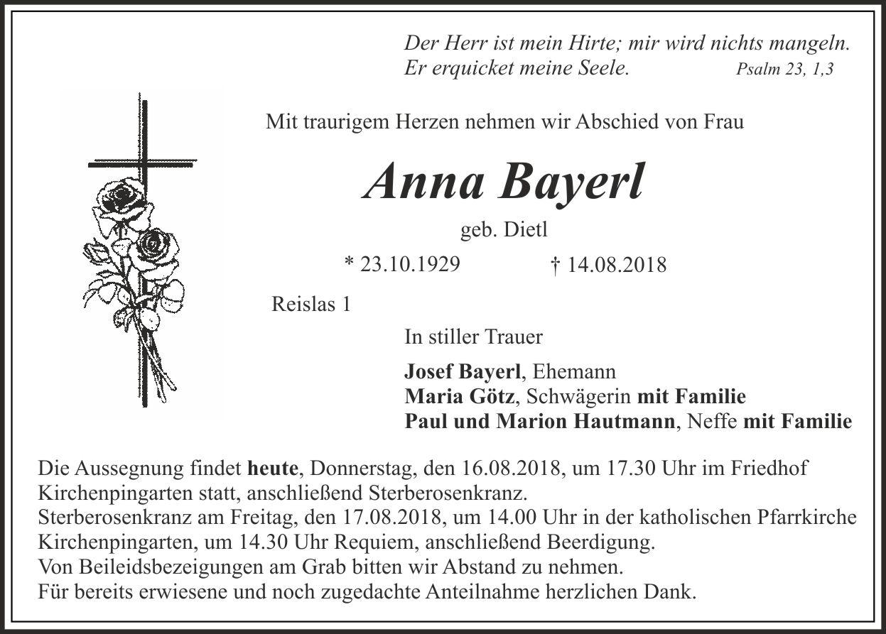 Aussegnung am Donnerstag, den 16.08.2018, um 17.30 Uhr im Friedhof Kirchenpingarten, anschließend Sterberosenkranz. Sterberosenkranz am Freitag, den 17.08.2018, um 14.00 Uhr in der katholischen Pfarrkirche Kirchenpingarten, um 14.30 Uhr Requiem, anschließend Beerdigung. Von Beileidsbezeigungen am Grab bitten wir Abstand zu nehmen. Für bereits erwiesene und noch zugedachte Anteilnahme herzlichen Dank.