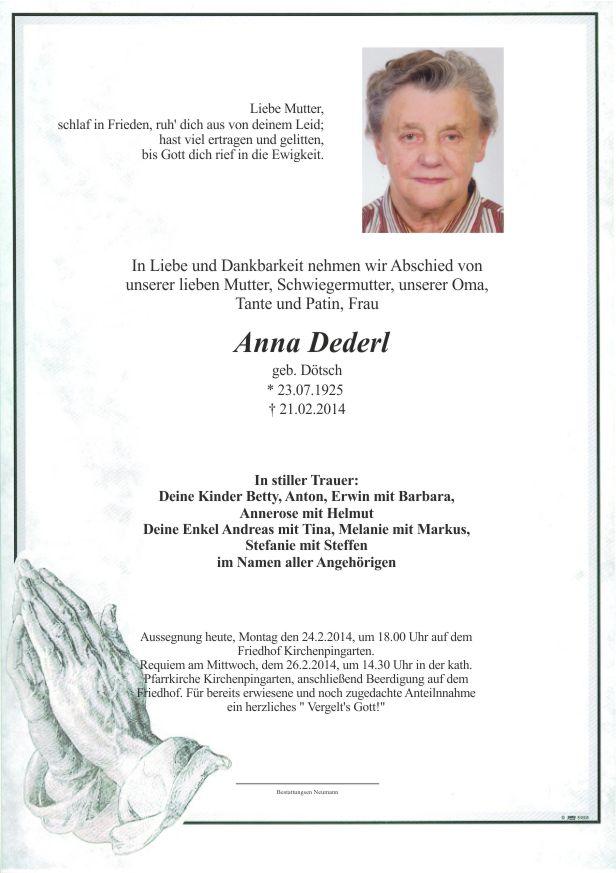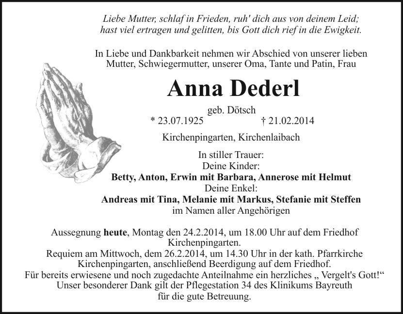 Requiem am Mittwoch, dem 26.2.2014, um 14.30 Uhr in der kath. Pfarrkirche Kirchenpingarten, anschließend Beerdigung auf dem Friedhof.