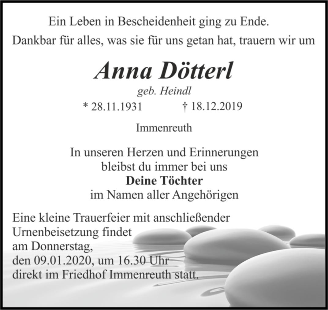 Eine kleine Trauerfeier mit anschließender Urnenbeisetzung findet am Donnerstag,den 09.01.2020, um 16.30 Uhr direkt im Friedhof Immenreuth statt.