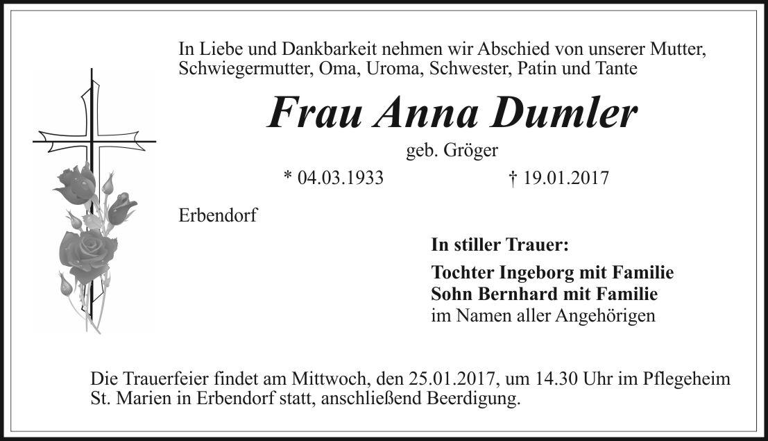 Die Trauerfeier findet am Mittwoch, den 25.01.2017, um 14.30 Uhr im Pflegeheim St. Marien in Erbendorf statt, anschließend Beerdigung.