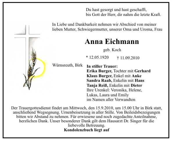 Der Trauergottesdienst findet am Mittwoch dem 15.9.2010 um 15.00 Uhr in Birk statt, anschließend Wegsegnung. Urnenbeisetzung in aller Stille. Von Beileidsbezeigungen bitten wir Abstand zu nehmen. Für erwiesene und noch zugedachte Anteilnahme herzlichen Dank.