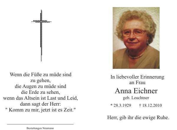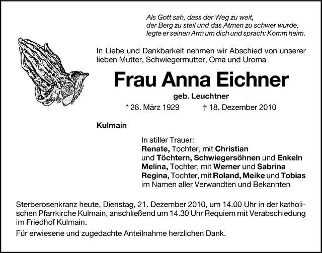 Der Trauergottesdienst findet am Dienstag, 21.12.2010 um 14.30 Uhr in Kulmain statt, anschließend Verabschiedung.