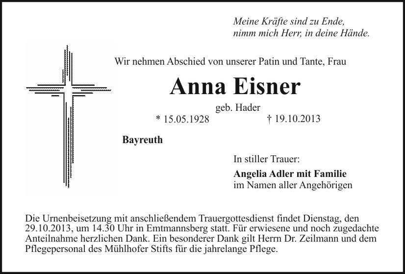 Die Urnenbeisetzung mit anschließendem Trauergottesdienst findet Dienstag, den 29.10.2013, um 14.30 Uhr in Emtmannsberg statt. Für erwiesene und noch zugedachte Anteilnahme herzlichen Dank. Ein besonderer Dank gilt Herrn Dr. Zeilmann und dem Pflegepersonal des Mühlhofer Stifts für die jahrelange Pflege.