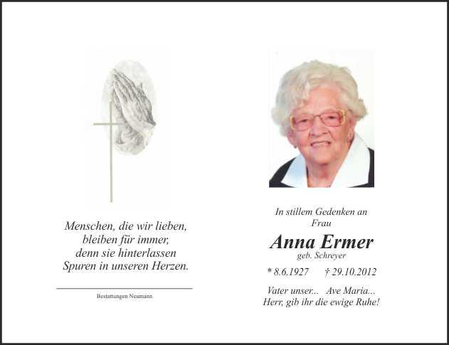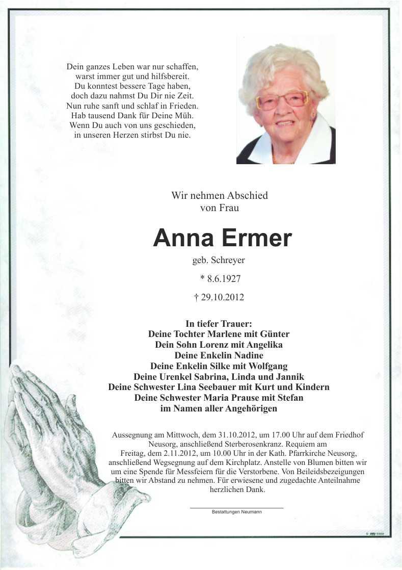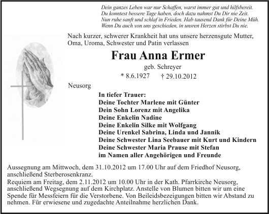 Requiem am Freitag, dem 2.11.2012 um 10.00 Uhr in der Kath. Pfarrkirche Neusorg, anschließend Wegsegnung auf dem Kirchplatz. Anstelle von Blumen bitten wir um eine Spende für Messfeiern für die Verstorbene. Von Beileidsbezeigungen bitten wir Abstand zu nehmen. Für erwiesene und zugedachte Anteilnahme herzlichen Dank.