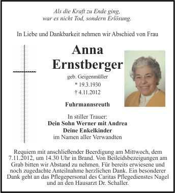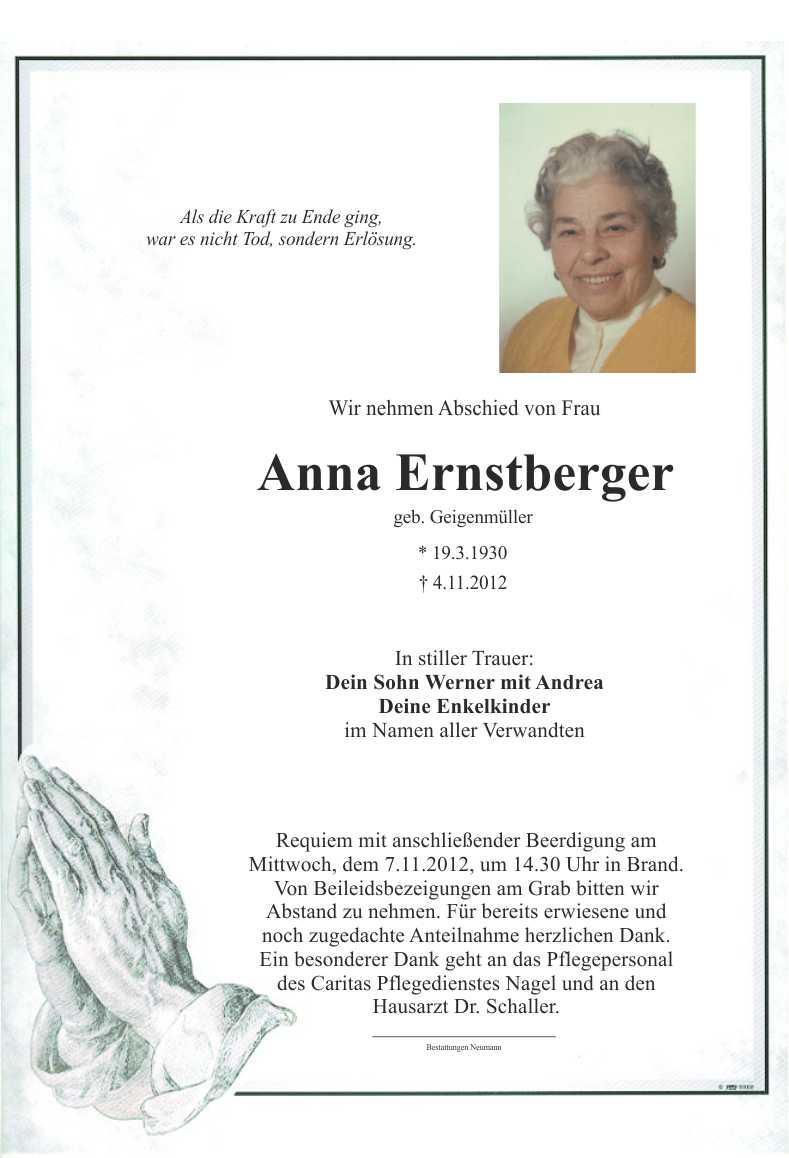 Requiem mit anschließender Beerdigung am Mittwoch, dem 7.11.2012, um 14.30 Uhr in Brand. Von Beileidsbezeigungen am Grab bitten wir Abstand zu nehmen. Für bereits erwiesene und noch zugedachte Anteilnahme herzlichen Dank. Ein besonderer Dank geht an das Pflegepersonal des Caritas Pflegedienstes Nagel und an den Hausarzt Dr. Schaller.