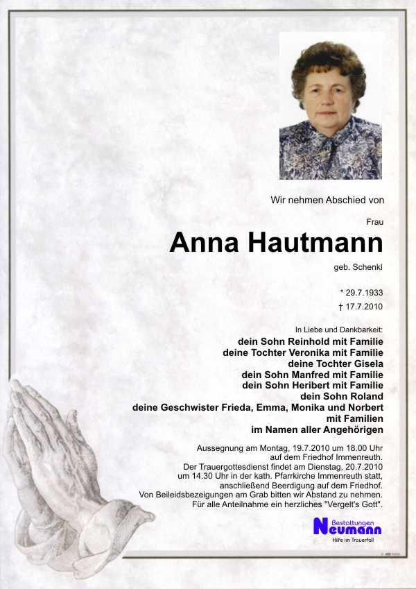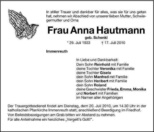 Der Trauergottesdienst findet am Dienstag, 20.7.2010 um 14.30 Uhr in der kath. Pfarrkirche Immenreuth statt, anschließend Beerdigung auf dem Friedhof.