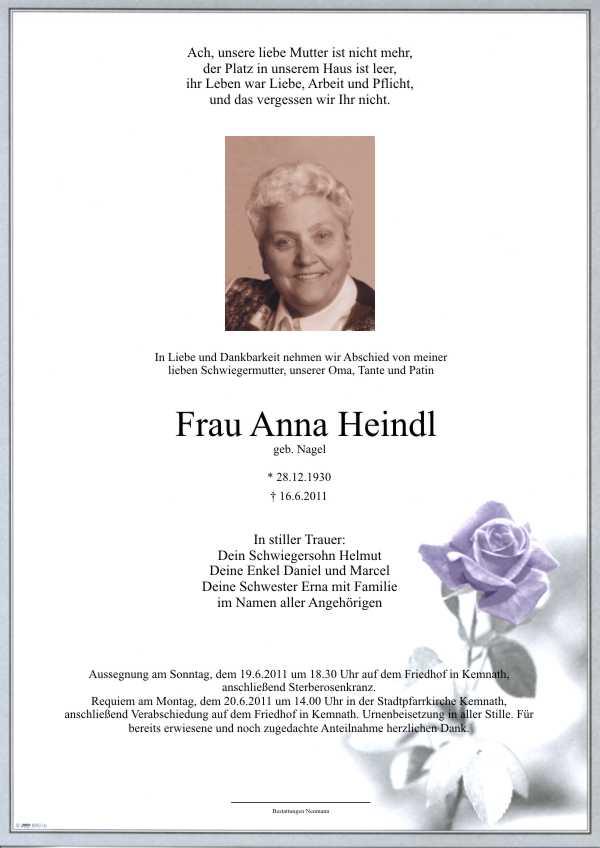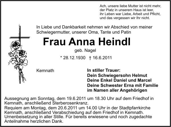 Die Beisetzung findet am Montag, 20.06.2011 um 14:00 Uhr auf dem Friedhof in Kemnath statt.