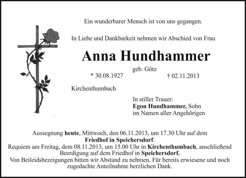 Requiem am Freitag, dem 08.11.2013, um 15.00 Uhr in Kirchenthumbach, anschließend Beerdigung auf dem Friedhof in Speichersdorf.