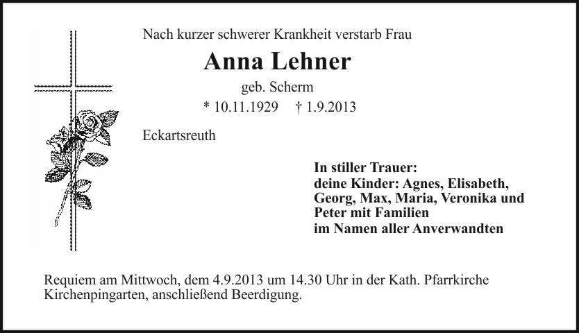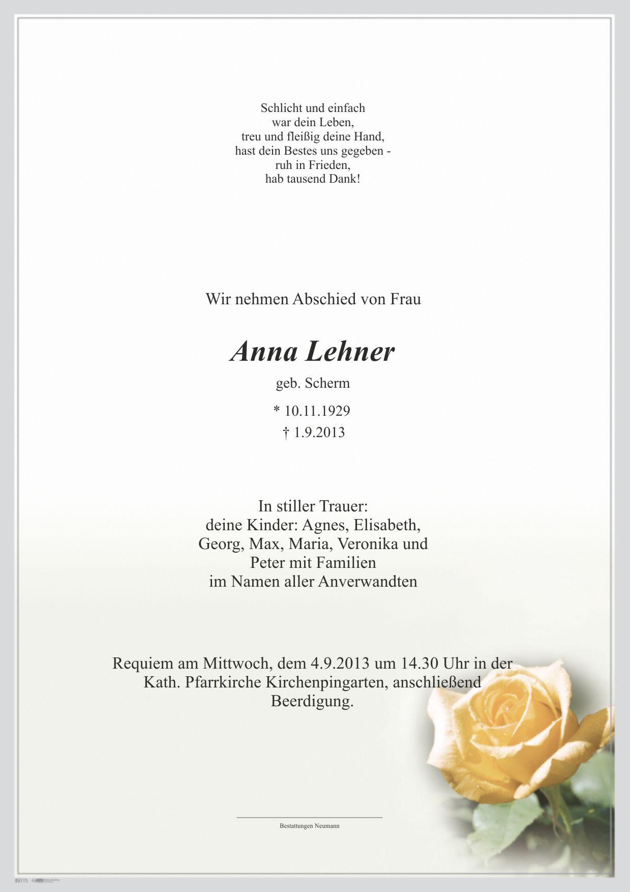 Requiem am Mittwoch, dem 4.9.2013 um 14.30 Uhr in der Kath. Pfarrkirche Kirchenpingarten, anschließend Beerdigung.