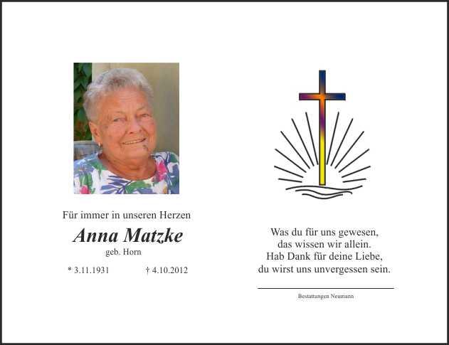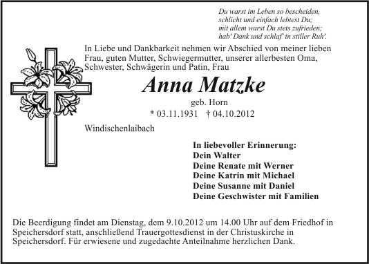 Die Beerdigung findet am Dienstag, dem 9.10.2012 um 14.00 Uhr auf dem Friedhof in Speichersdorf statt, anschließend Trauergottesdienst in der Christuskirche in Speichersdorf. Für erwiesene und zugedachte Anteilnahme herzlichen Dank.